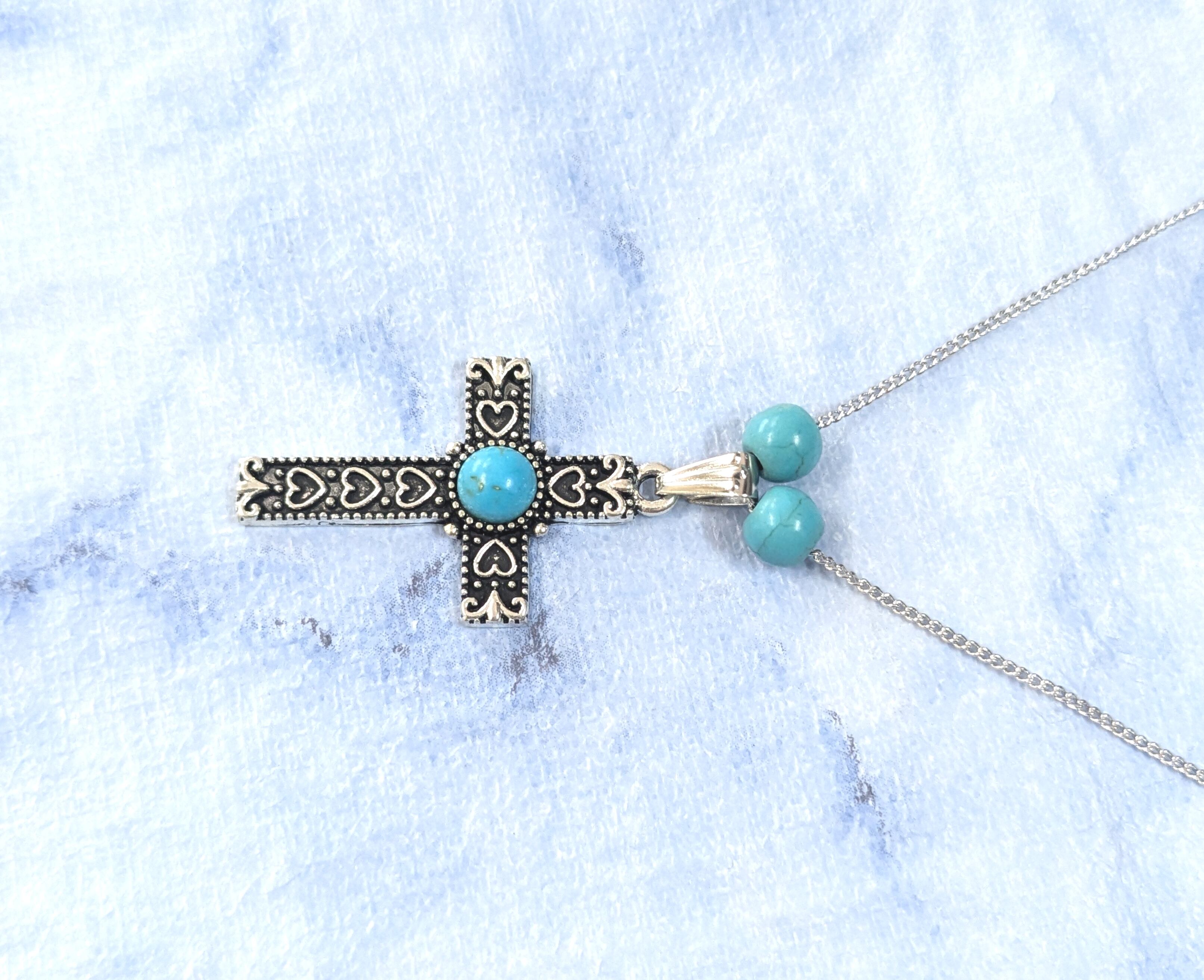 レディースネックレス ブルーターコイズ&シルバー ハートクロス T-926
