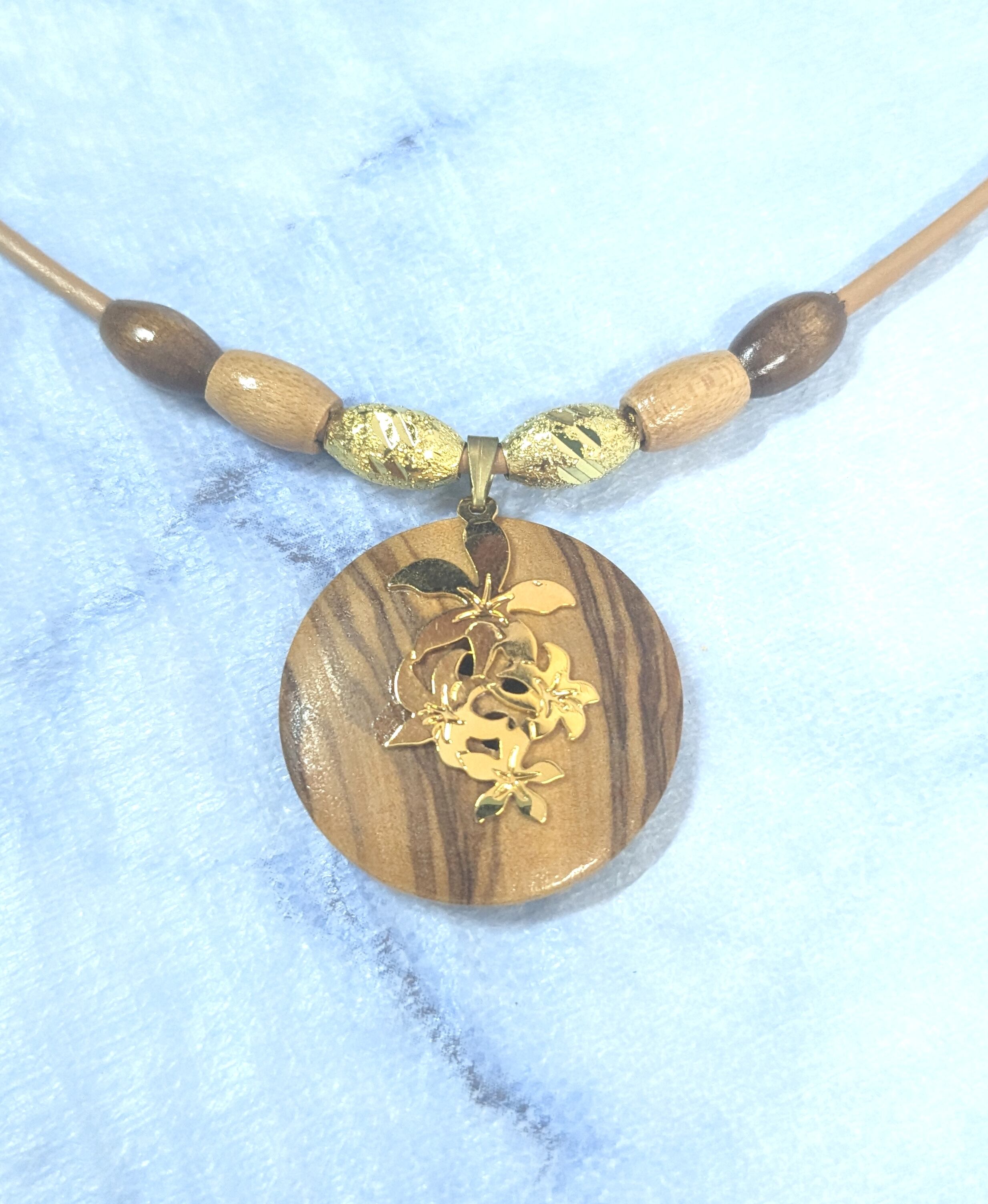 ハワイアンネックレス 天然ウッド&ゴールドハイビスカス 本革紐 B-706