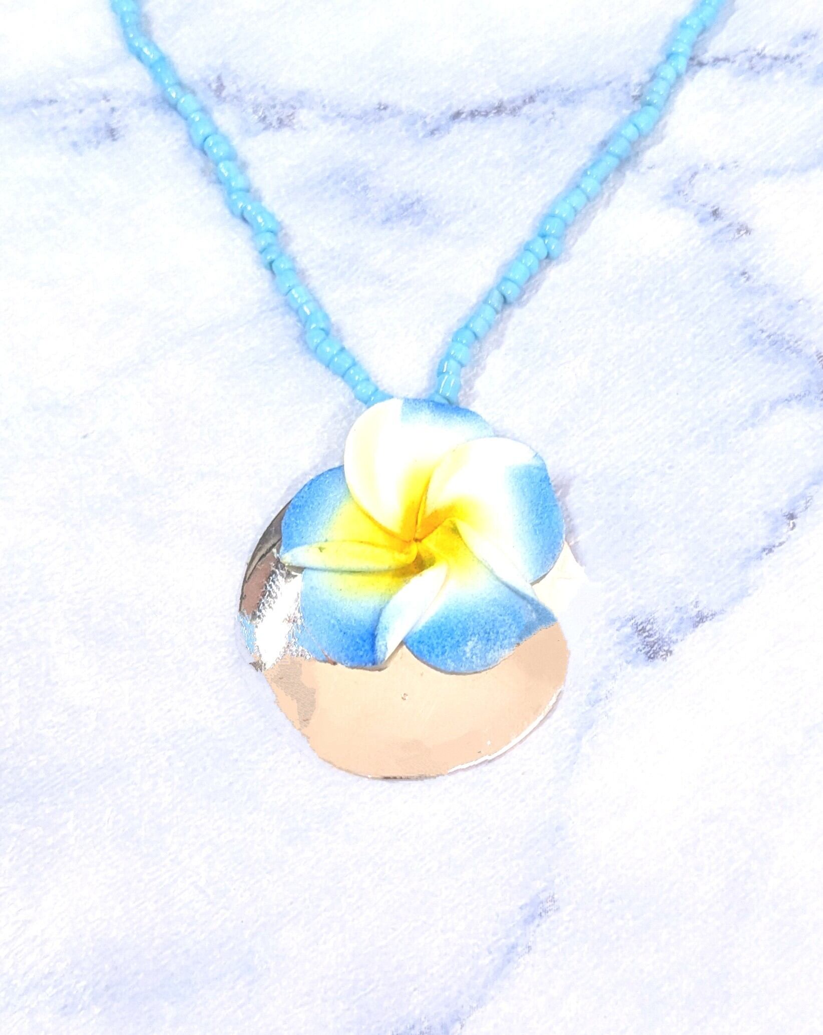 ハワイアンネックレス ライトブループルメリア& シルバーサークル P-672