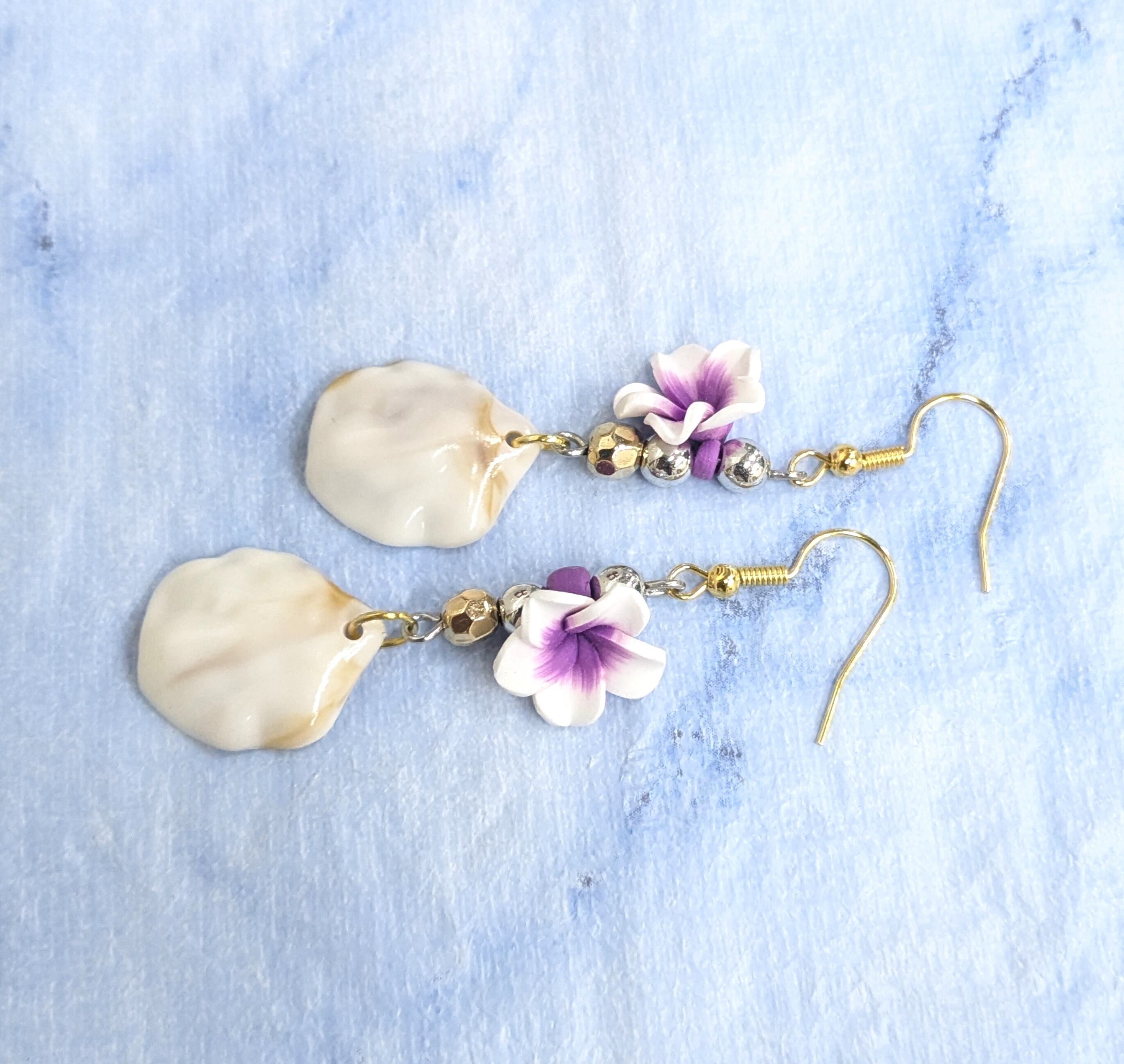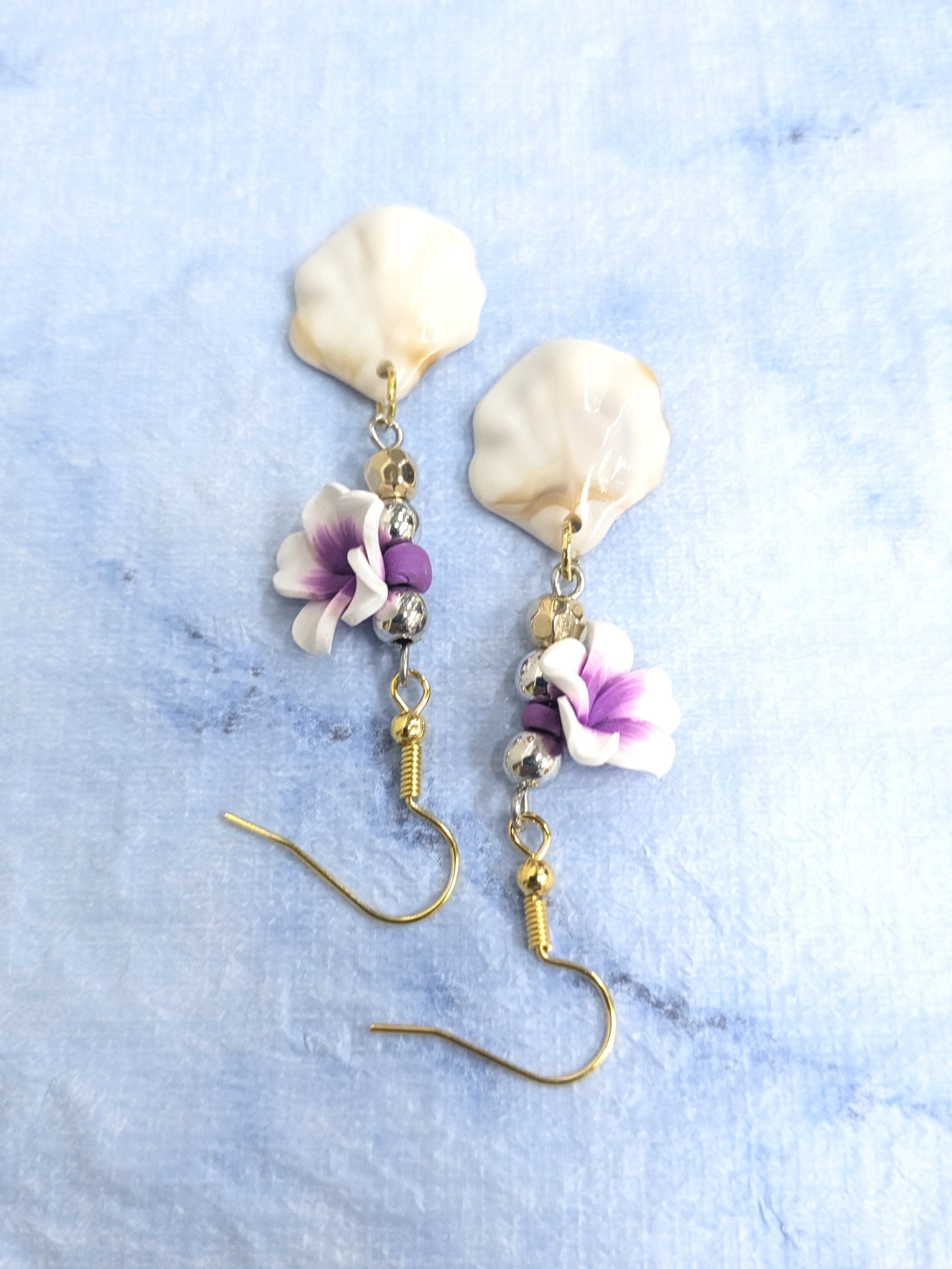 ハワイアンピアス ホワイトパープルプルメリア& ホワイトシェル A-220