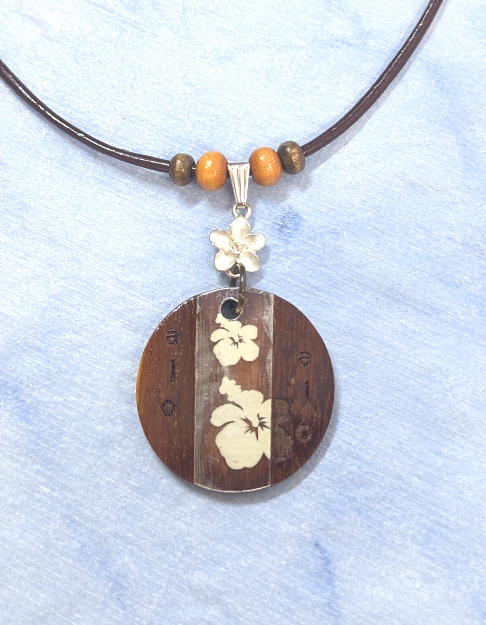 ハワイアンネックレス ナチュラルウッドハイビスカス& シルバープルメリア B-707
